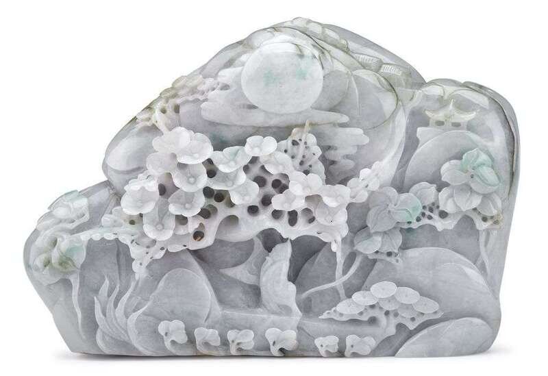 Carved and hollowed to front to display an image of a scholar standing underneath prunus branches in the moonlight, wrapped to back with designs of pavilions, clouds, and pines in a mountainous landscape; jadeite of greenish white with bluish green streaks to base and to back.