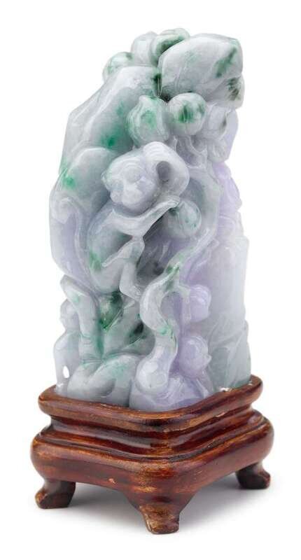 The translucent stone creatively carved to show an unusually shaped rock wrapped by peach tree branches and four amused monkeys; affixed on a wooden stand.