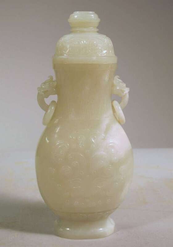 Of typical form raised over an everted foot rim, carved to show triangular streaks to neck, ruyi and other archaic symbols to body on both sides; the lid carved to show similar designs, connected with two ringed dragon-head handles.