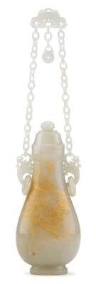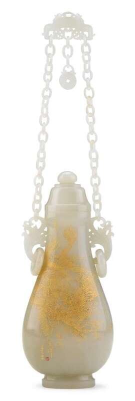 Of flattened ovoid form with fitted cover and raised on footed rim, the vase is mounted by two ringed wave-form handles, connected with a ruyi lock and coin by a chain; the body intricately painted with gold dragon and phoenix amid flowy clouds; signed by artist with mark.