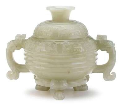 Of footed globular form with dragon-ead handles, raised on 3 carved feet resembling that of mythical beasts; carved with relief bands of phoenix to body and cover.
