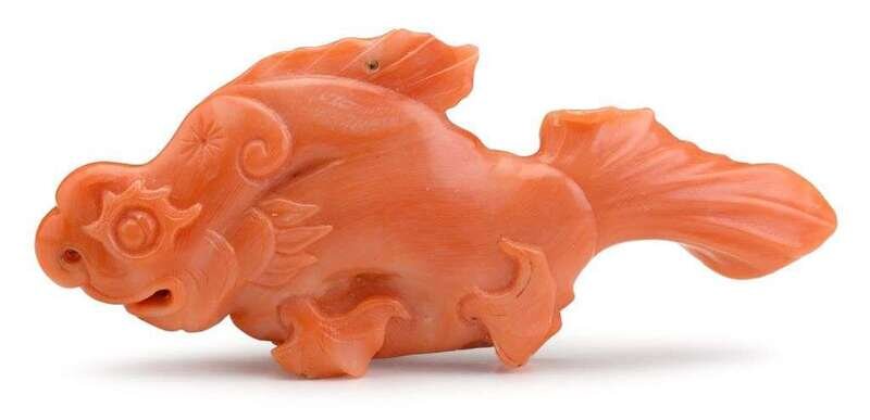 Of unusual form, the pendant is carved to depict a carp with dragon head and two pairs of fins to stomach; coral of cream red hue.