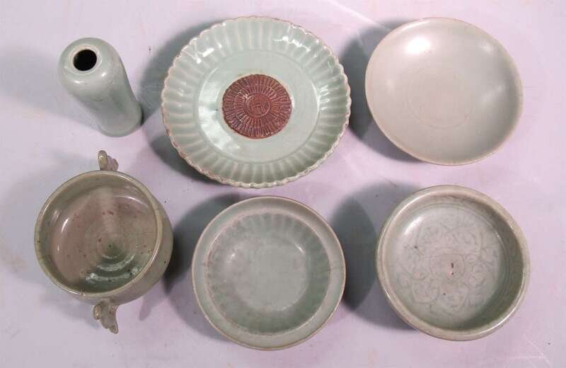 Including a unusual 'character' medallion petal molded dish, together with five other objects.