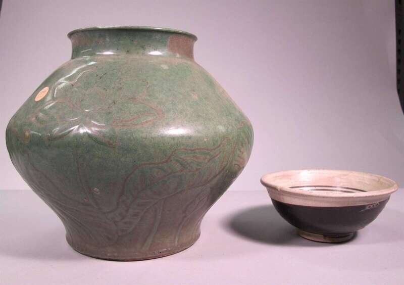 Comprising a large green glazed jar with wide waist decorated to exterior with molded lotus flowers and leaves; and a cizhou bowl decorated to interior with flowers and concentric circles, museum numbers to base.