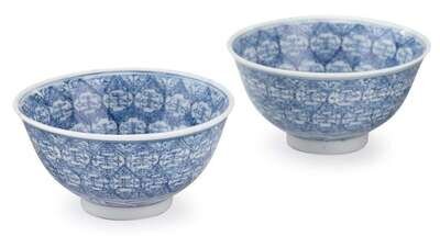 The small footed bowls with slightly everted rims decorated throughout with dense geometric pattern in underglaze blue.