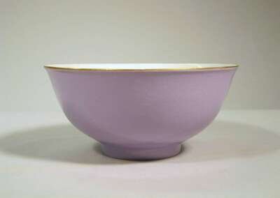 Bowl of typical form with slightly everted rim and raised on foot ring; decorated to exterior with soft lavender tone and with gilded rim.
