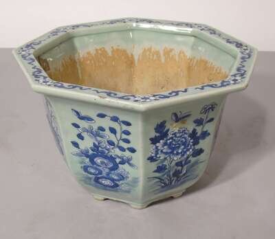 Of octagonal form, decorated in blue and white slip glaze over a light blue ground to show flowers and insects.