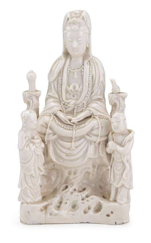 Depicting the goddess seated on a rootwood throne and wearing robes and beads; flanked by two attendants as well as a bird and a meiping vase that rest on trunk like stands.