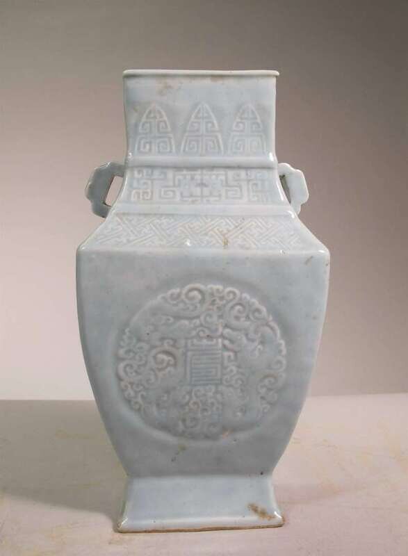 The square form vase with twin handles issuing from neck molded to show four circular cartouches with central "hu" characters, archaic motifs throughout.