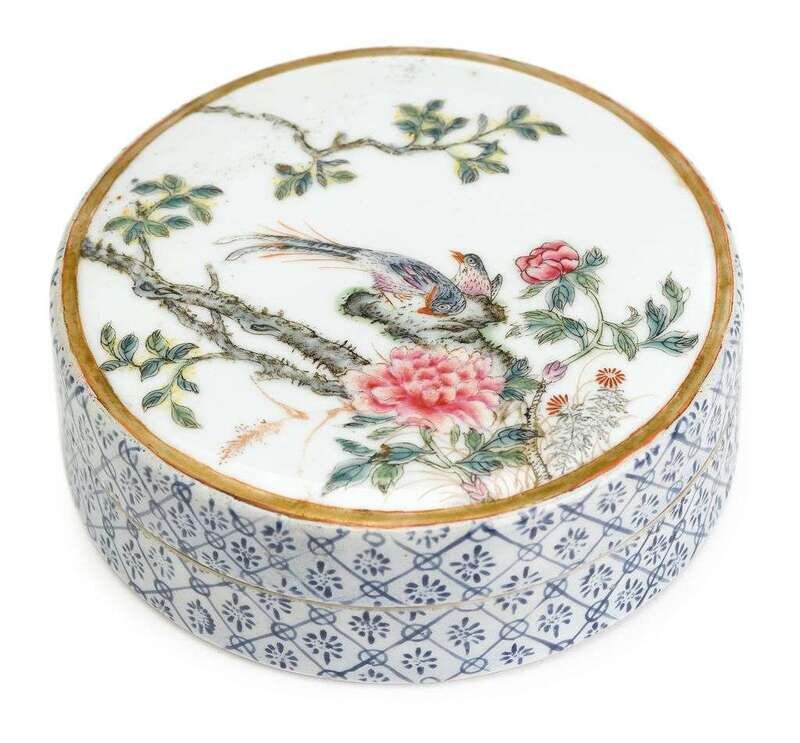The circular box enameled to cover with image of birds on flowering branches, and to sides in a repeating pattern resembling cloth.