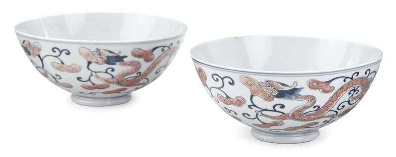 Pair of Chinese copper-red decorated blue and white porcelain dragon bowls six character kangxi marks, qing dynasty