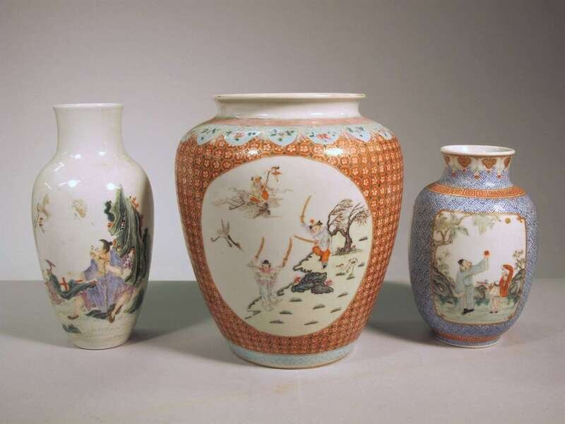 Comprising a large jar decorated with three circular panels over a diaper ground depicting classical and mythological figures; a juren tang style vase showing scholar and attendant; and an ovoid vase with three panels of showing classical figures over a geometric ground.