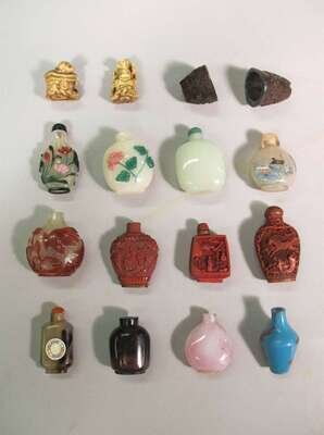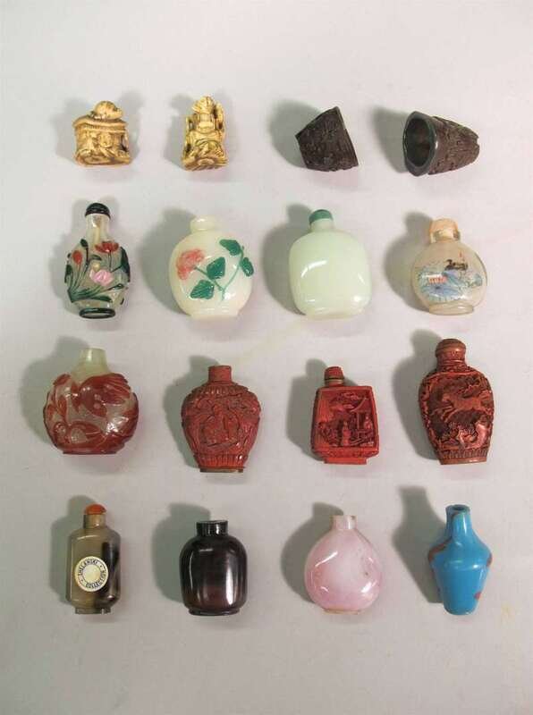 Comprising nine glass bottles of various forms and types, two bamboo cups, three cinnabar snuff bottles and two Japanese bone netsuke (16).