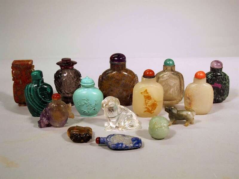 Comprising a zoisite and ruby bottle, two quartz bottles, two agate bottles, and other snuffs and miniature carvings carved from crystal, lapis, turquoise, malachite, amethyst and jade (15).