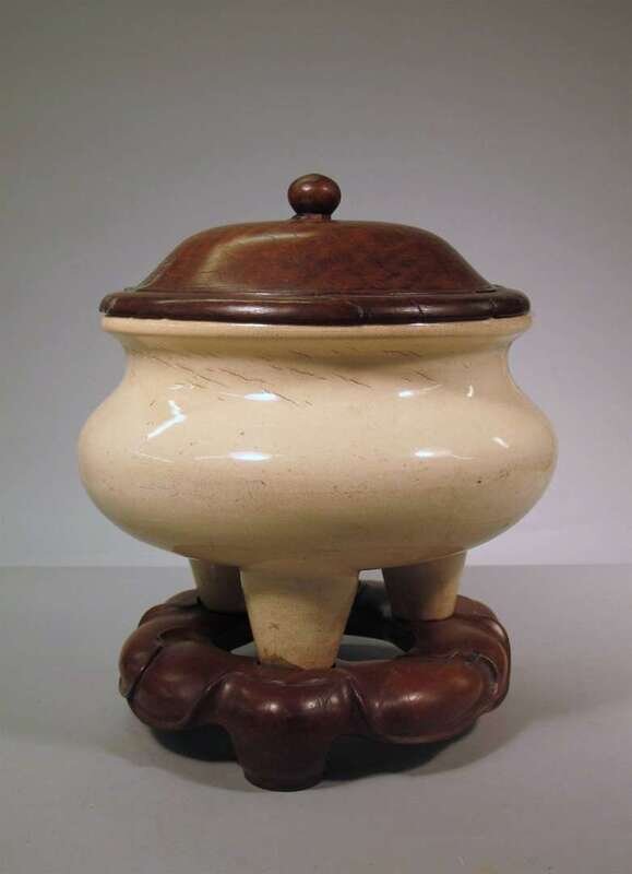 The heavily potted vessel with cream colored glaze and tight craquelure raised on three sturdy cylindrical legs; obscure incised mark to base, likely Japanese; with wooden stand and cover.