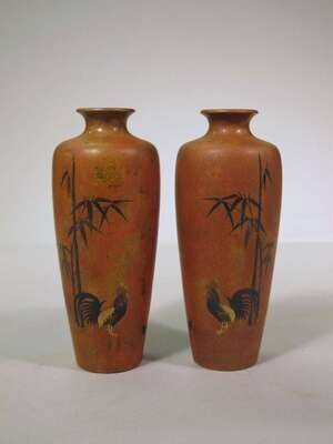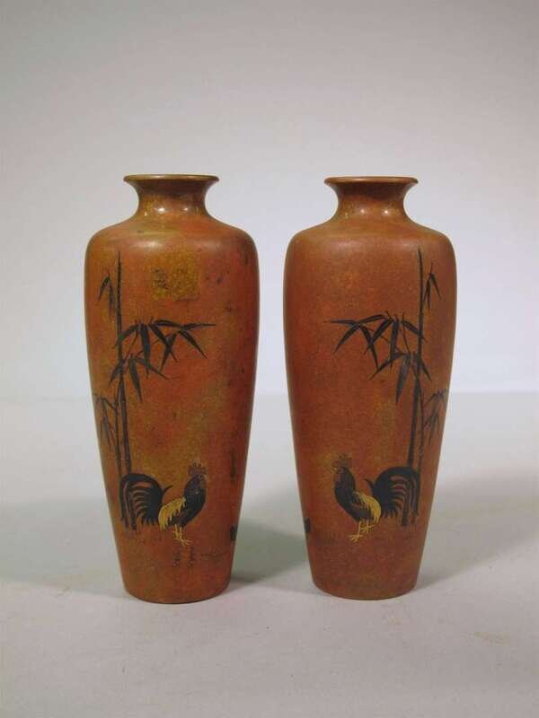The tapering cylindrical vases with short necks and everted rims, inset with mixed metals to show roosters and bamboo.