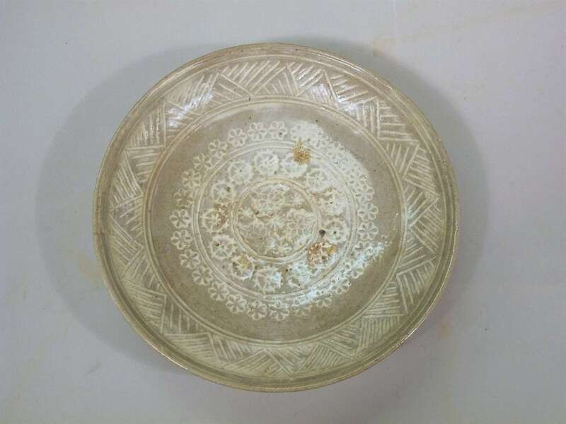 The shallow dish raised on unglazed earthenware foot, decorated with inlaid slip glaze on grey celadon ground.