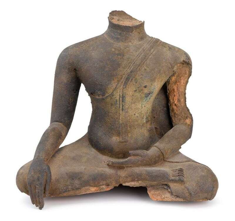 The torso of Buddha dressed in simple robes and seated in Dhyanasana position; headless and with loses to arm and base.