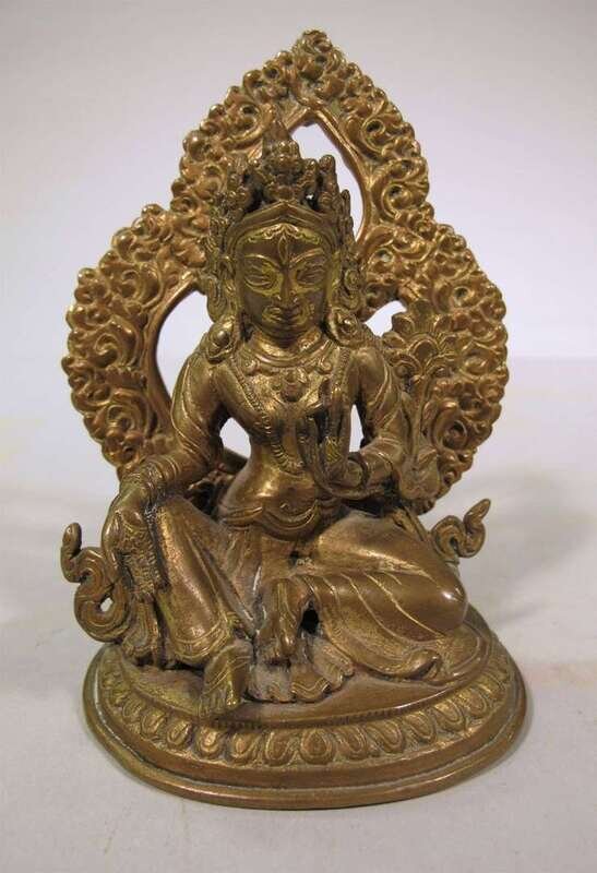 The Tara seated in lalitasana on a lotus throne, hands in ravi-mudra, wearing flowing garments and sash, adorned by beaded necklace and headdress, flanked by a lotus flower to left and a gourd shape mandorla to back.