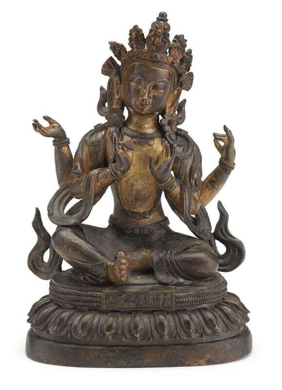 The four-armed bodhisattva sits over a lotus base with legs apart, hands in harina mudra, wearing an open robe adorned by a beaded necklace and loose sashes, carrying a serene expression; seven character "Daqing Qianlong nian zaozhi" mark carved to front above the lotus base, three characters "Fen Nu Mu" carved to front below lotus, and four characters "De Xing Gen Ben" carved to back; unsealed hollow base.