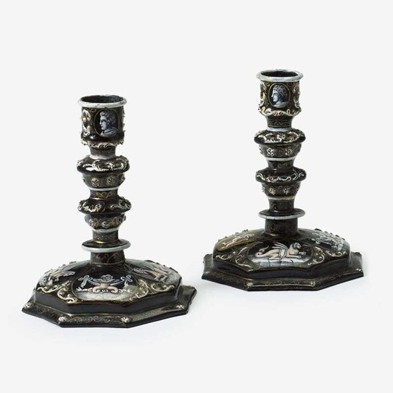 Pair of Limoges grisaille enamel candlesticks 19th century