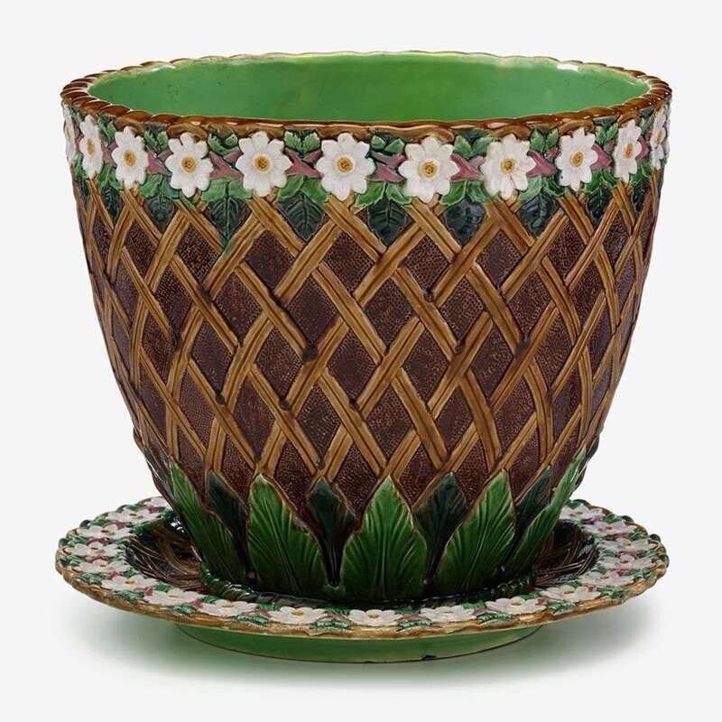 Finely molded with a border of white daisies above trellis work and stiff leaf base, with conforming stand, the underside of stand impressed Mintons, 14, with date cypher for 1863 and other marks.