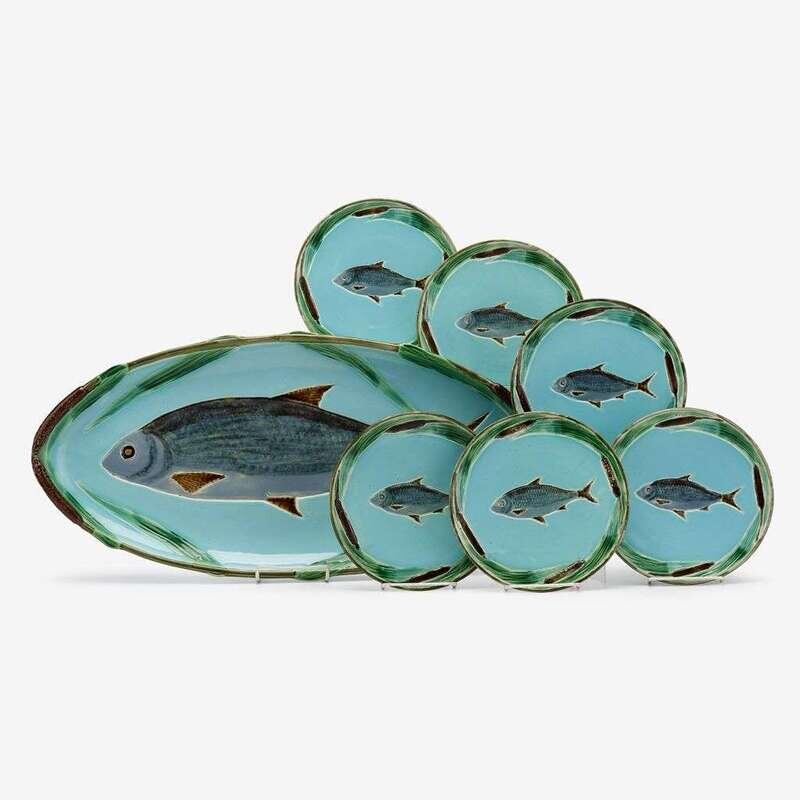 Joseph Holdcroft majolica fish platter and plates late 19th century