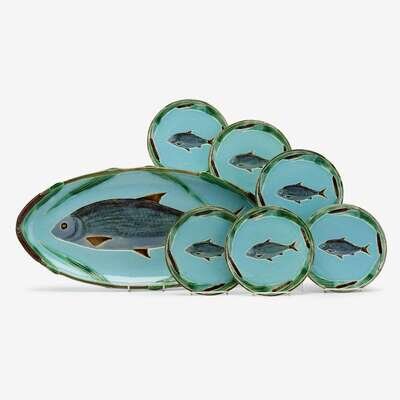 Comprising one platter and six dishes, each depicting a salmon trout on a turquoise ground bordered by cattails, the platter raised on further cattails applied to the base, the platter and four dishes impressed J.Holdcroft to underside. (7).