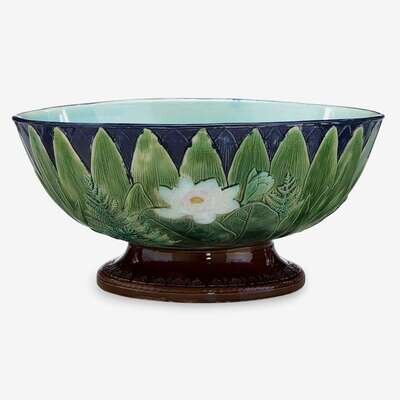 The cobalt exterior modeled with pond lilies, ferns and other leaves, raised on a stepped circular foot molded with a ruyi head and cable twist border, impressed J.Holdcroft to underside.