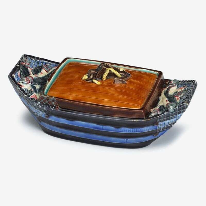Modeled in the form of a fisherman's skiff named the 'Sardinia', the blue striped body supporting nets with catch at each end, the cover surmounted by a rope wrapped anchor finial, the base impressed with registration lozenge, signed underglaze 2582.