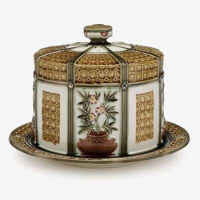 Decorated in the Luther pattern, the dome surmounted by flattened knob finial encircled by eight ribbed white glazed radials continuing to brown glazed lattice molded panels, the sides molded with panels containing plants in archaic vessels and lattice panels against a cream ground, on conforming stand, the dome signed underglaze, the dish also signed to underside and impressed Wedgwood, date cypher likely for 1884.