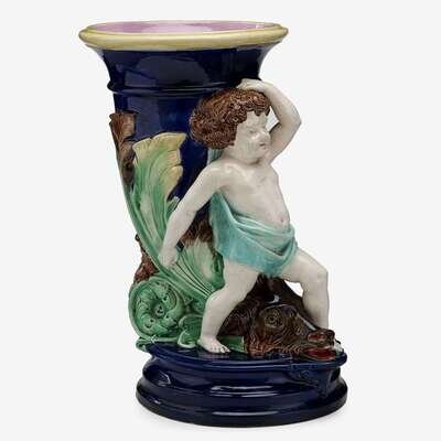 Modeled in the form of a Bacchic putti standing against an acanthus wrapped rhyton terminating in a boar's head, raised on circular form cobalt plinth.