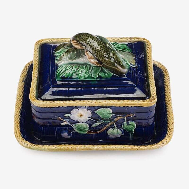 The cover surmounted by overlapping sardines on a bed of seaweed, the body molded with flowering branches against the cobalt glazed wood molded ground, joined to integral dish, unmarked.