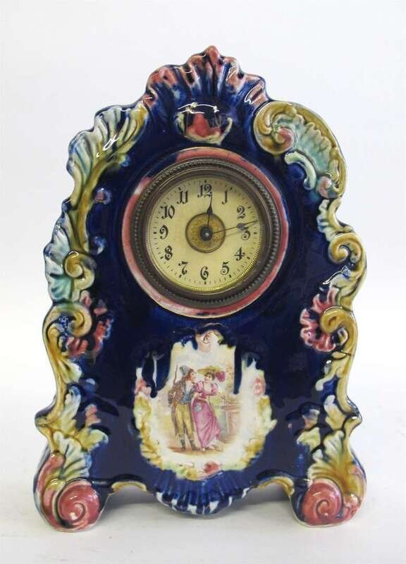 The circular dial with Arabic hours, the shaped case with scrolls and leaves at the edge, centered by a courting couple, raised on scroll feet.