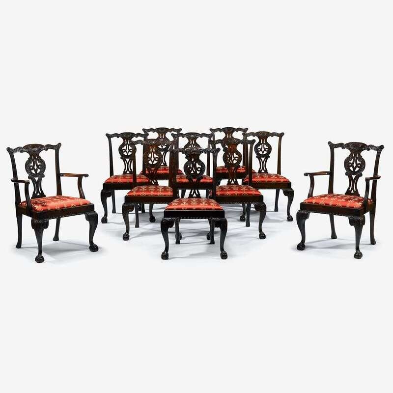 Comprising two armchairs and eight sidechairs, the acanthus and rosette carved crestrail over interlaced vasiform splats and fluted uprights, trapezoidal drop-in seat, raised on acanthus carved cabriole legs, terminating in claw and ball feet. (10).