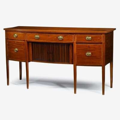 The bowfront top over three shallow and two deep line inlaid drawers centered by tambour door opening to a single shelf, raised on square tapering legs.
