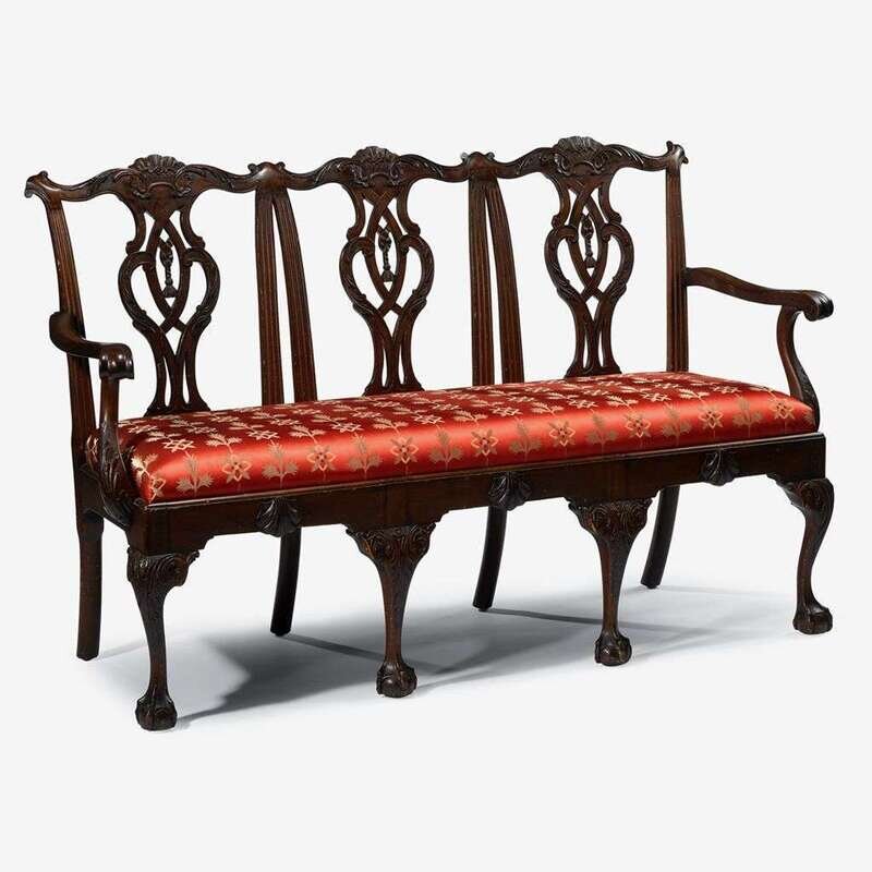 The shell and acanthus carved crestrails over three interlaced vasiform splats and fluted uprights, shaped arms with scroll grips, long trapezoidal drop-in seat, the frieze with three scallop shells, raised on carved cabriole legs terminating in claw and ball feet.