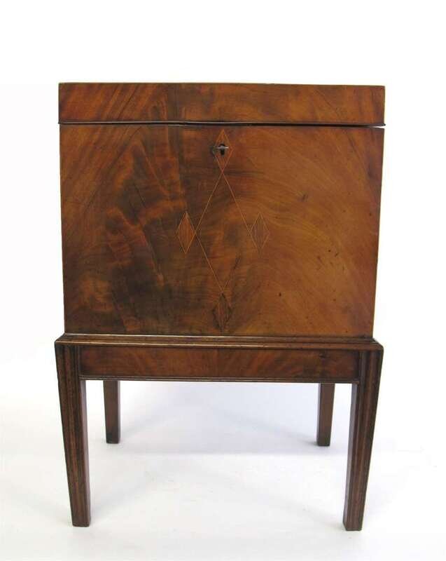 George III parquetry inlaid crossbanded mahogany cellarette 18th century