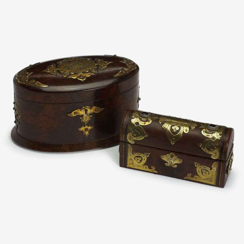 Oval form, the hinged lid centered by an Arabesque, opening to a lidded compartment; together with a Victorian brass mounted leather casket, inset with stone cabochons, both with keys. (2).