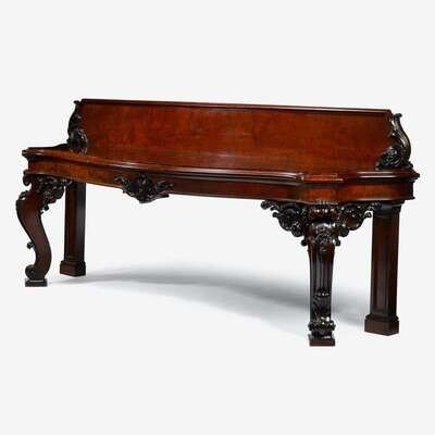 The serpentine top with molded edge and long upright back panel with acanthus carved ends, raised on stout scroll and leaf carved forelegs and wide straight rear legs.