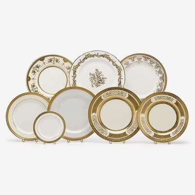 Comprising twelve Minton dinner plates, retailed Davis Collamore & co. New York; eleven Wedgwood dinner plates; twelve Hammersley dinner plates; twelve Spode dinner plates, retailed Ovington Bros. New York, and twelve similar luncheon plates, retailed Caldwell, Philadelphia; twelve Cauldon side plates, retailed Plummer & Co. New York; together with seventeen others, Lenox and Hutschenreuther. (approx 76).