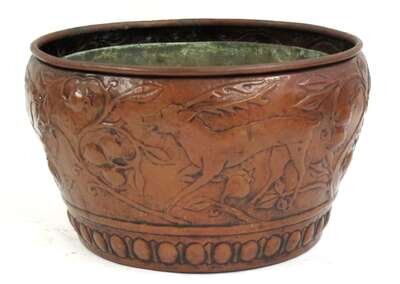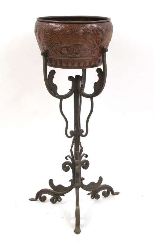 English Arts & Crafts hammered and repoussé copper jardiniere and wrought iron stand possibly newlyn school, circa 1905