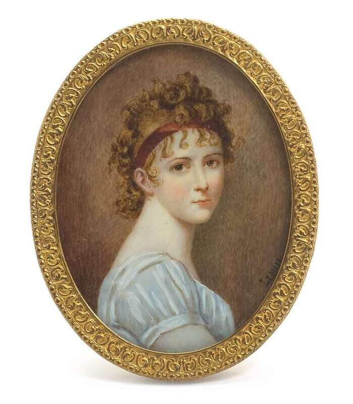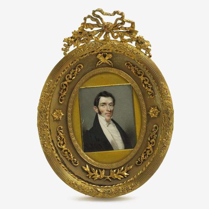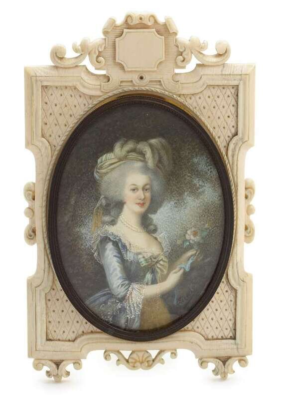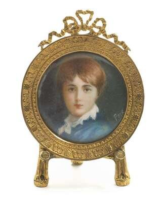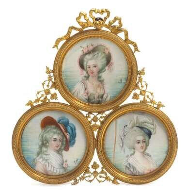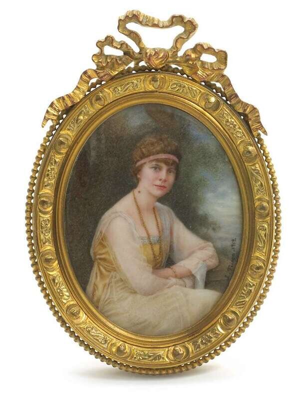 Including a miniature on ivory, signed L. Frison 1919, by Lucienne Frison-Fabrice (French, b. 1889), a portrait of a lady signed Leroux, in finely carved ivory frame, and a finely painted portrait of an English gentleman on ivory in finely cast gilt bronze frame; together with five other miniatures, three in conjoined frame. (6).