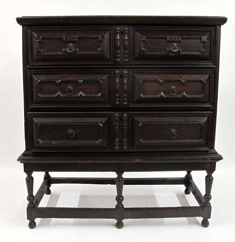 The molded rectangular cornice over confoming case containing three long carved and paneled drawers raised on turned supports joined by stretchers, terminating in ball feet.