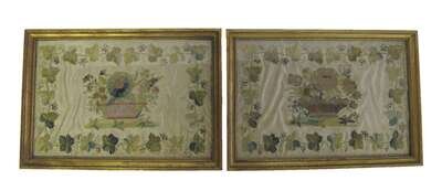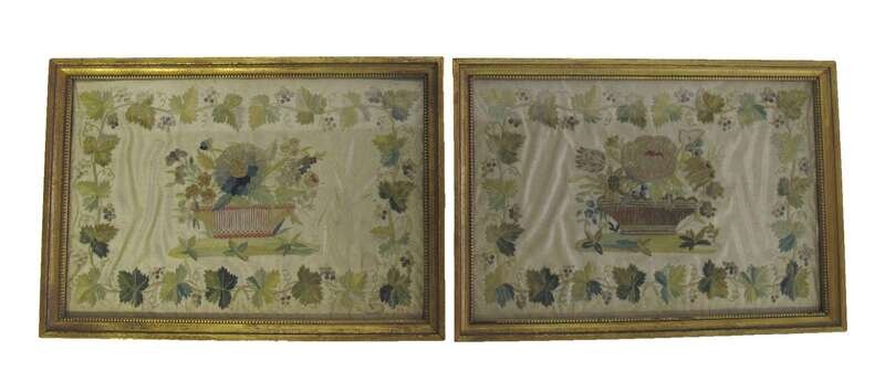 Embroidered in colored silks to show a flower filled basket within a border of grape bearing vines, in gilt frames. (2).