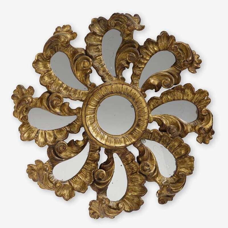 The central circular mirror plate with carved edge surrounded by eight elaborately carved rocaille swirls enclosing teardrop shaped mirror plates.