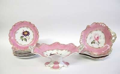 Each finely painted to the center with a flower against a cream ground within shaped and gilt rim, comprising an oval tazza, seven side dishes, and three leaf form dishes. (11).