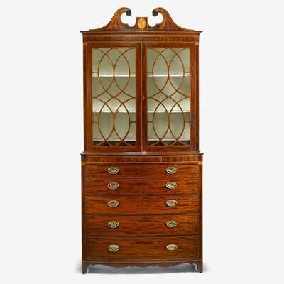 In two sections; the upper section with broken pediment cornice carved with paterae terminals centered by oval cartouche over two astragal glazed cabinet doors opening to three shelves and three short drawers, the lower section with a line inlaid frieze and a central hidden drawer over a secretaire drawer opening to a tooled leather ratcheted writing surface and a series of drawers, pigeonholes, and doors over three graduated long drawers and shaped apron, raised on square bracket feet.