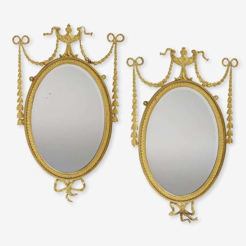 The oval beveled mirror plate within lamb's tongue molded sight, surmounted by urn issuing laurel leaf swags joining bows to either side, and ribbon at bottom. (2).