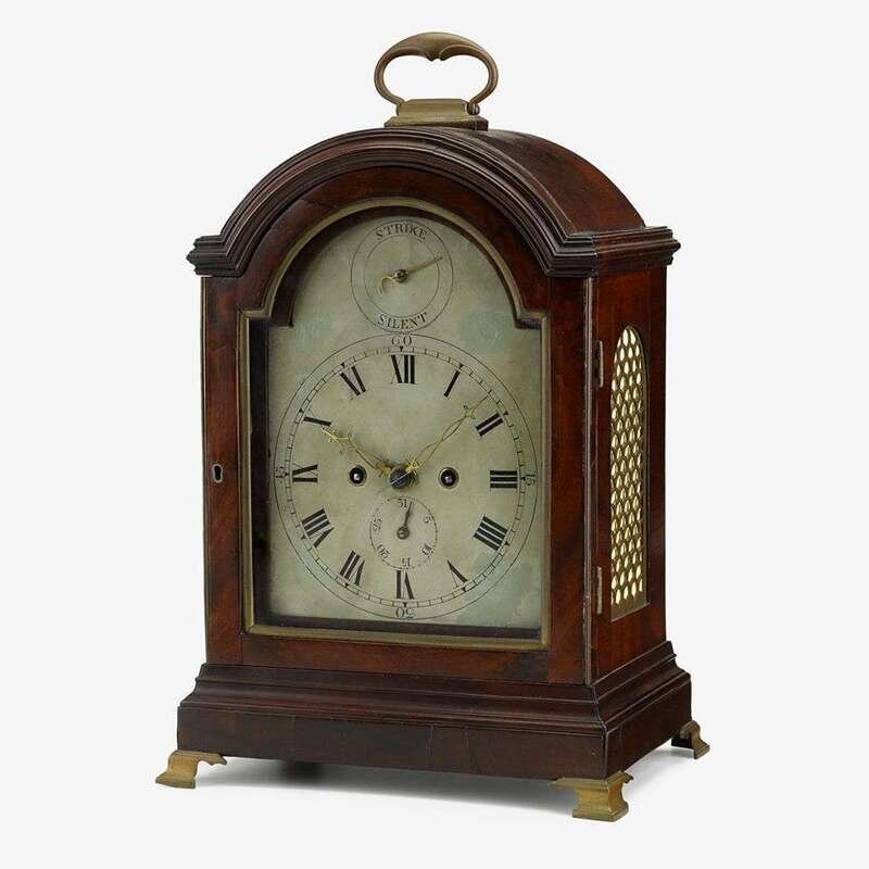 The dome-top case with brass handle and pierced brass sound frets to sides and glazed door to back, all raised on ogee bracket feet, the painted dial with subsidiary strike dial above time dial with Roman hours and Arabic minutes, enclosing a further subsidiary seconds dial with Arabic numerals, the brass movement engraved with bird and floral cartouche and "Jn:o Sharp Tower Street London".
